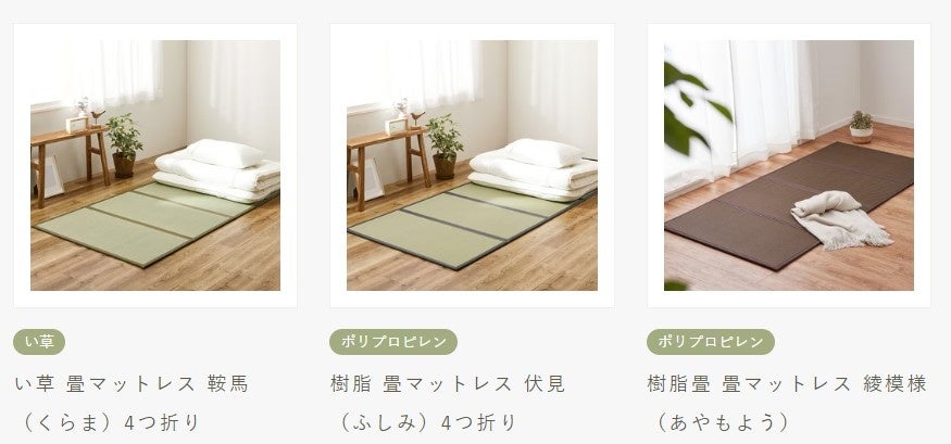 必要な時だけ広げて使える畳マットレスや、瀬戸内海をモチーフに織り上げられたJAPONISMを感じるラグなどを提供しています。
