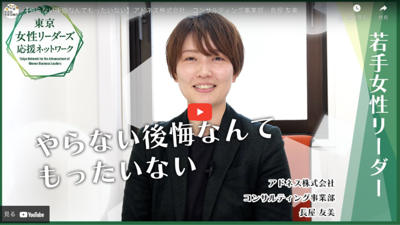 アドネス株式会社(本社:東京都新宿区四谷)コンサルティング事業部長の長屋友美が、東京都推進の「東京女性リーダーズ応援ネットワーク」でインタビューを受け、3月28日に動画公開されました。