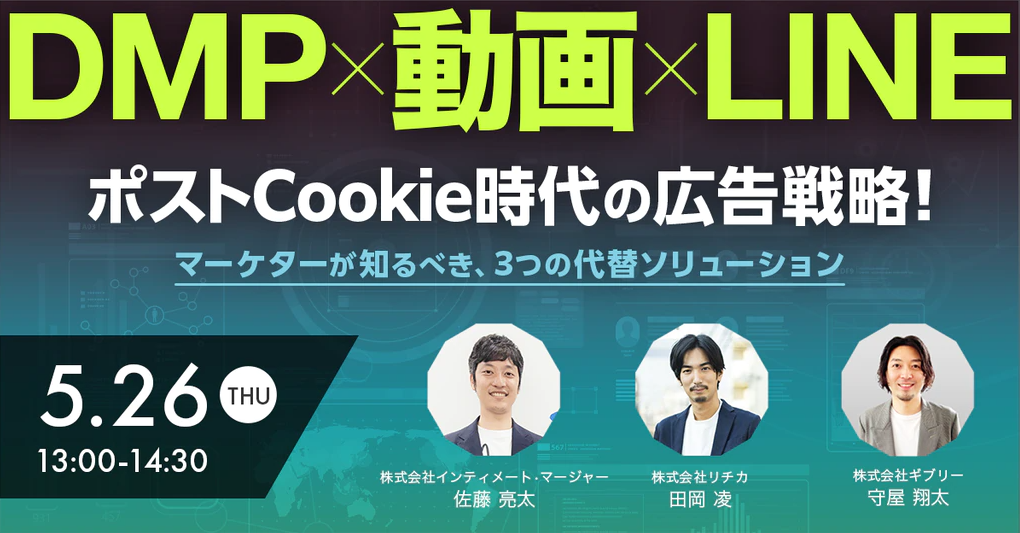 国内最大級パブリックDMPを提供するデータプラットフォームカンパニーの株式会社インティメート・マージャー(本社:東京都港区、代表取締役社長:簗島 亮次、以下当社)は、マーケティングテクノロジーを活用したソリューションを提供し、デジタル領域の「レベニュー最大化」の支援事業を展開する株式会社ギブリー(本社:東京都渋谷区、代表取締役社長:井手 高志、以下ギブリー)とSaaS × Agencyでマーケティング支援事業を提供する株式会社リチカ(本社:東京都渋谷区、代表取締役:松尾幸治、以下リチカ)と合同で無料オンラインセミナー「ポストCookie時代の広告戦略!マーケターが知るべき3つの代替ソリューション~DMP×動画×LINE~」を5月26日(木)13時00分より共催することをお知らせします。
