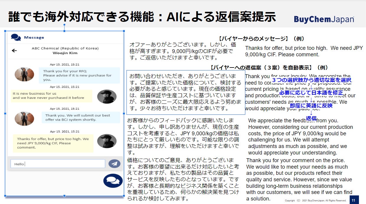 化学品専門マーケットプレイスBuyChemJapanに国内メーカー様向けのAI翻訳チャット機能が実装されました。