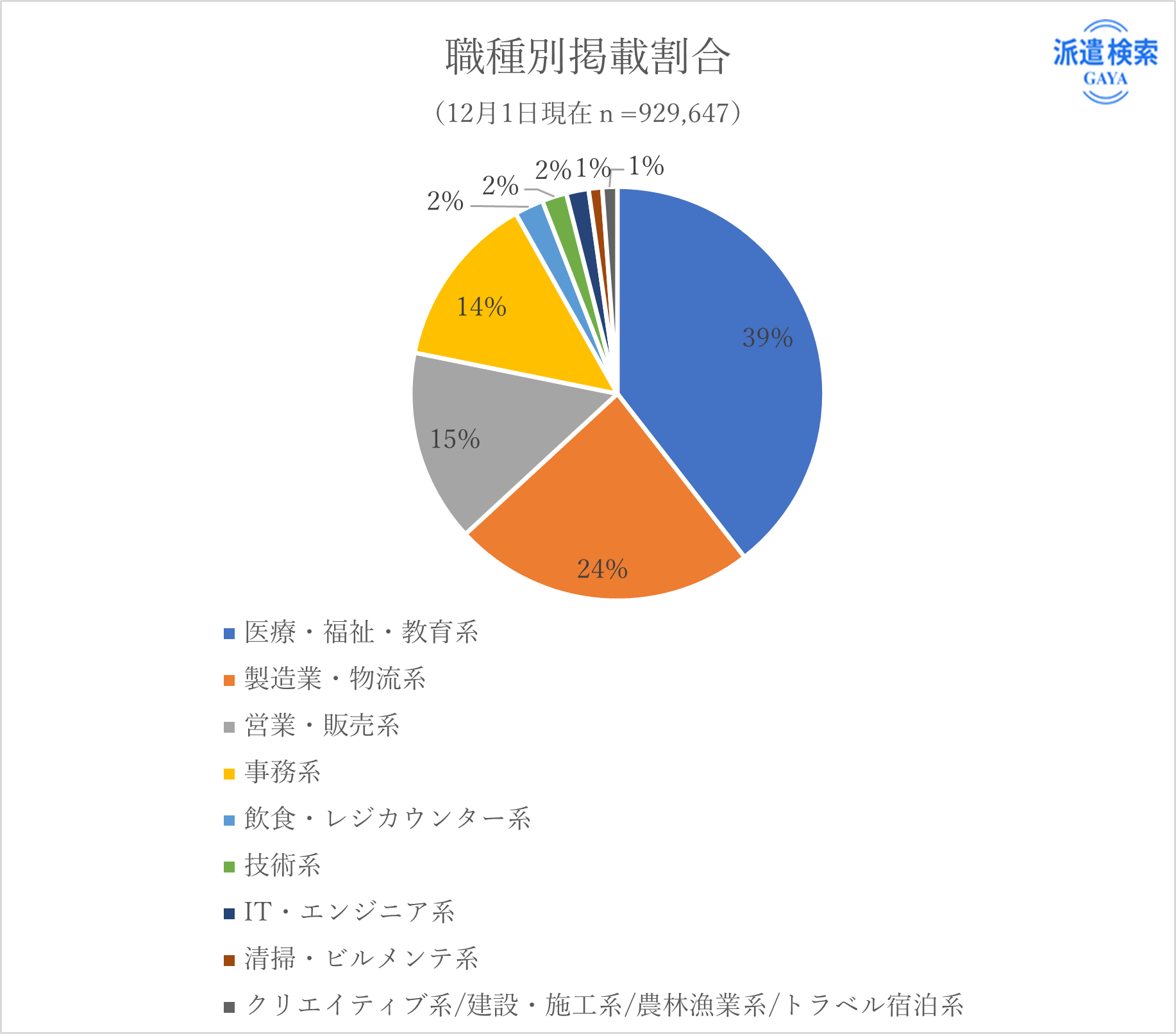 GAYA掲載派遣求人のうち最も多い職種は「医療・福祉・教育系」の39%でした。続いて製造業・物流系24%、営業・販売系、事務系15%、事務系14%と11月と同じ順位となりました。職種ごとに増減はありましたが上記4職種で全体の92%以を占める結果となりました。求人数増減でみると技術系104%、製造・物流系103%の増加、これら以外の職種は減少という結果となりました。