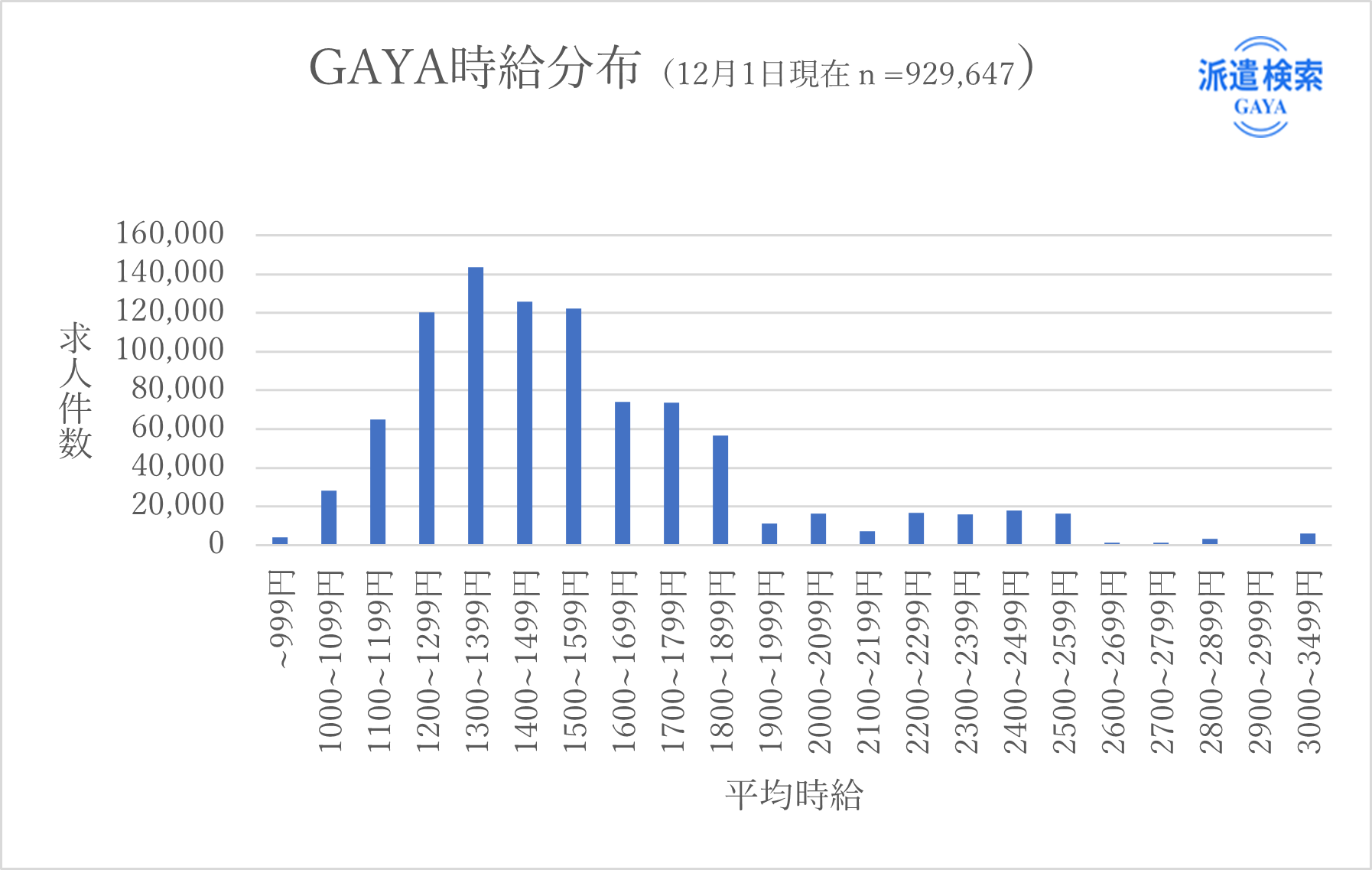 GAYA12月度の平均時給は1,525円と11月から8円増加しました。求人全体の時給を細分化してみると1番多い時給が1,300円~1,399円と全体の15.2%、1,400円~1,499円13.3%、1,500円~1,599円13.0%、と1,300円~1,599の高時給の割合増加が継続しました。