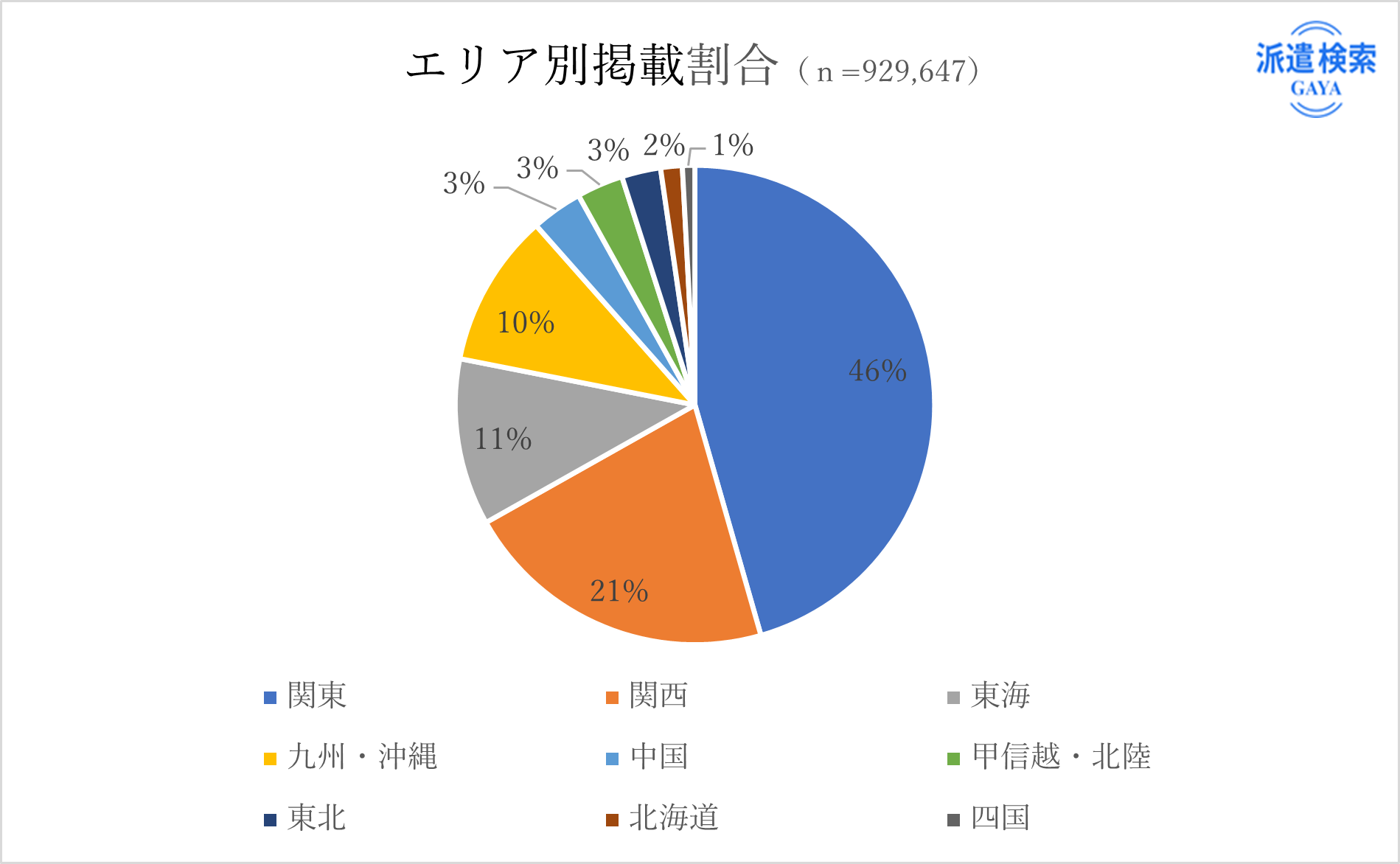 GAYA12月エリア別掲載件数は関東が前月を7%上回る46%、関西は2%減の21%、東海は1%減の11%という結果になりました。また、全体の掲載件数では11月度の940,719件から12月929,647件と求人数は11,072件減となりました。