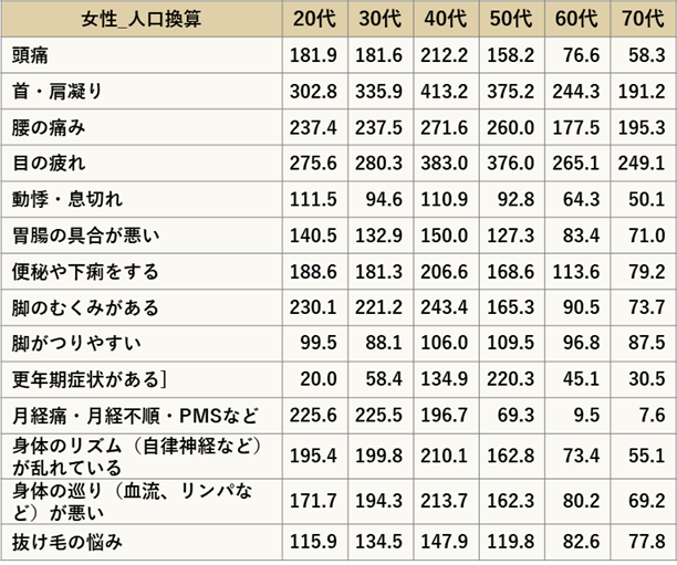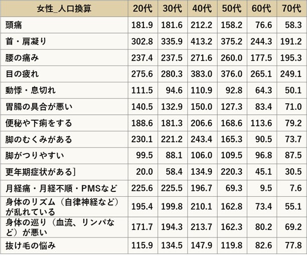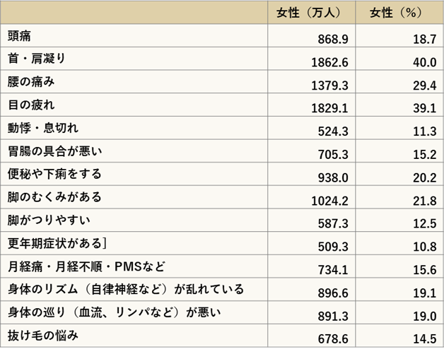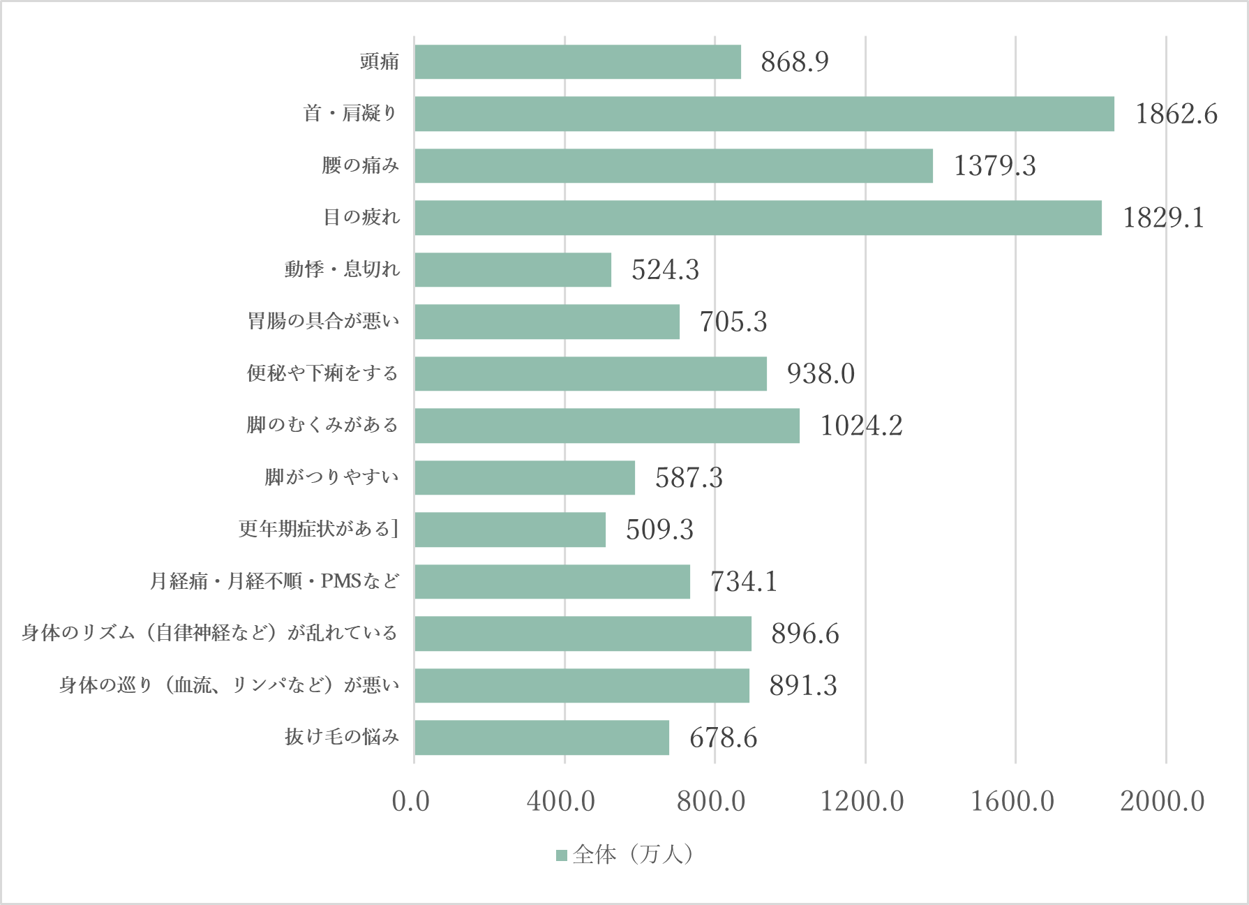 女性の身体の不調・悩みの割合を比較すると、「首・肩凝り」40.0%、「目の疲れ」39.1%、「腰の痛み」29.4%、「脚のむくみがある」21.8%、「便秘や下痢をする」20.2%の順になっている。この割合を年代ごとに人口換算を行い合計すると、「首・肩凝り」1862.6万人、「目の疲れ」1829.1万人、「腰の痛み」1379.3万人、「脚のむくみがある」1024.2万人、「便秘や下痢をする」938.0万人という結果となった。