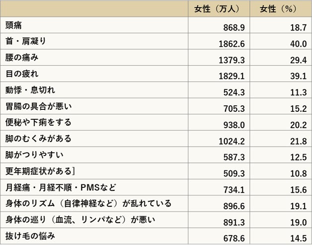 女性の身体不調を人口換算、「首・肩凝り」1862.6万人、「目の疲れ」1829.1万人、DX化・在宅スタイルが影響か