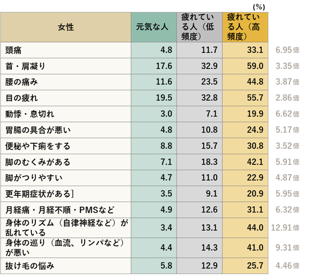 〈図表4:身体の不調・悩み_割合(全国、女性、20~79歳、疲労度合別)単位:%〉