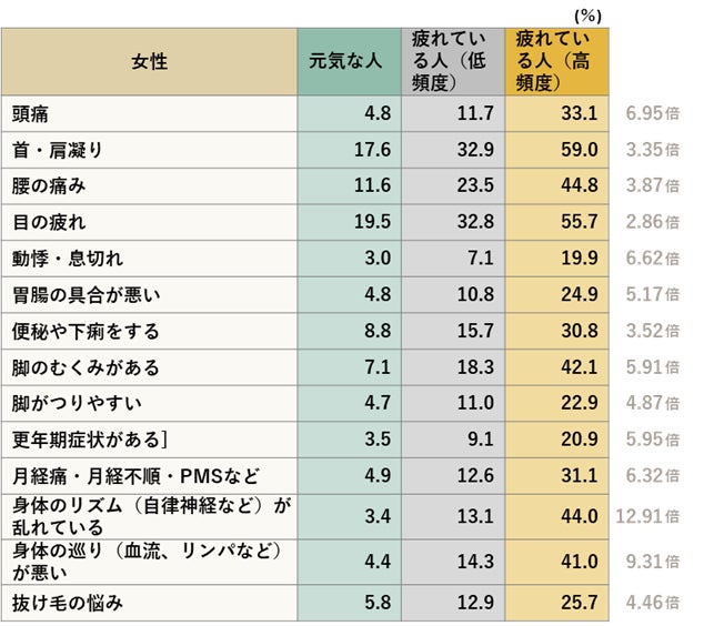 身体の不調・悩みを疲労度合別で比較すると、元気な人は目の疲れ19.5%、首・肩凝り17.6%、腰の悩み11.6%、疲れている人(低頻度)は首・肩凝り32.9%、目の疲れ32.8%、腰の痛み23.5%、疲れている人(高頻度)は首・肩凝り59.0%、目の疲れ55.7%、腰の痛み44.8%となっており、TOP3の症状は変わらない。元気な人と比べ疲れている人(高頻度)の多い症状は、身体のリズム(自律神経など)が乱れている12.91倍、身体の巡り(血流、リンパなど)が悪い9.31倍、頭痛6.95倍となっており、自律神経や代謝や身体の流れに関する症状に大きな差が見られる。