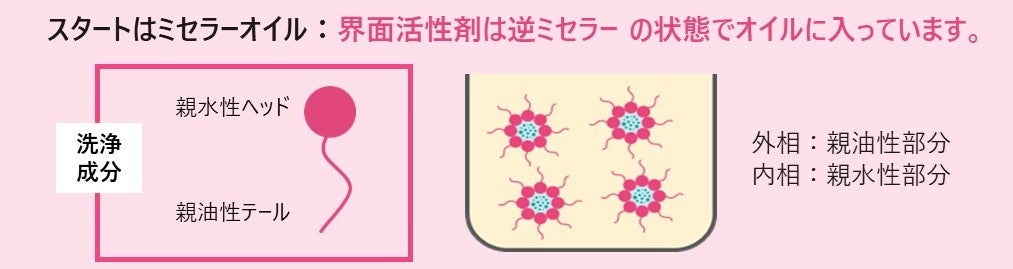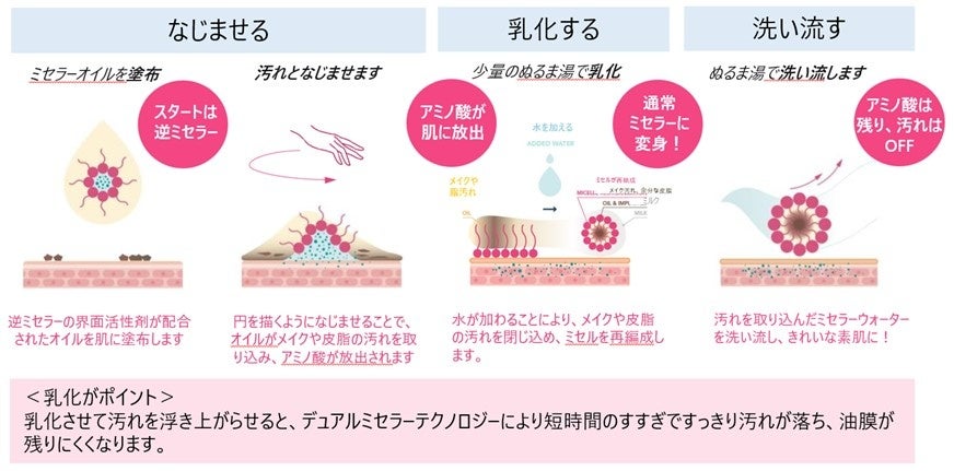 汚れを落としながらスキンケア成分を肌に残すことを実現する、逆ミセラーからミセラーに変化するテクノロジー。スタート時には外相が親油性成分、中にスキンケア成分を取り込んだ逆ミセラーの状態でオイルに入った洗浄成分が、肌にスキンケア成分を届けます。その後、オイルを乳化することにより洗浄成分がミセラーに変わります。このミセラーが汚れを取り込み、肌戻りなくしっかり汚れを落とします。