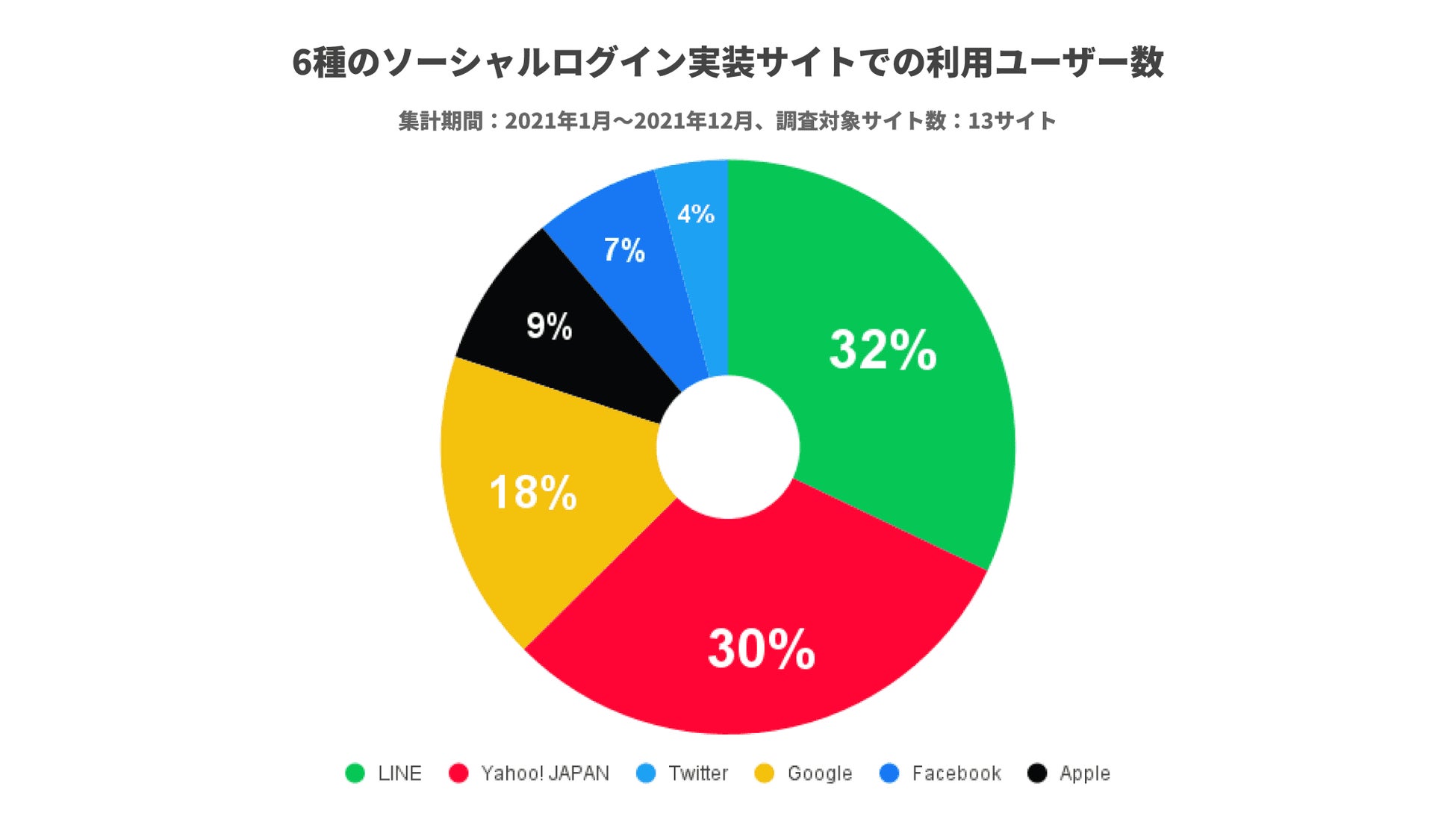 - 6種実装サイトでの利用ユーザー数は、1位がLINEログインで32%、2位がYahoo! JAPANログインで30%