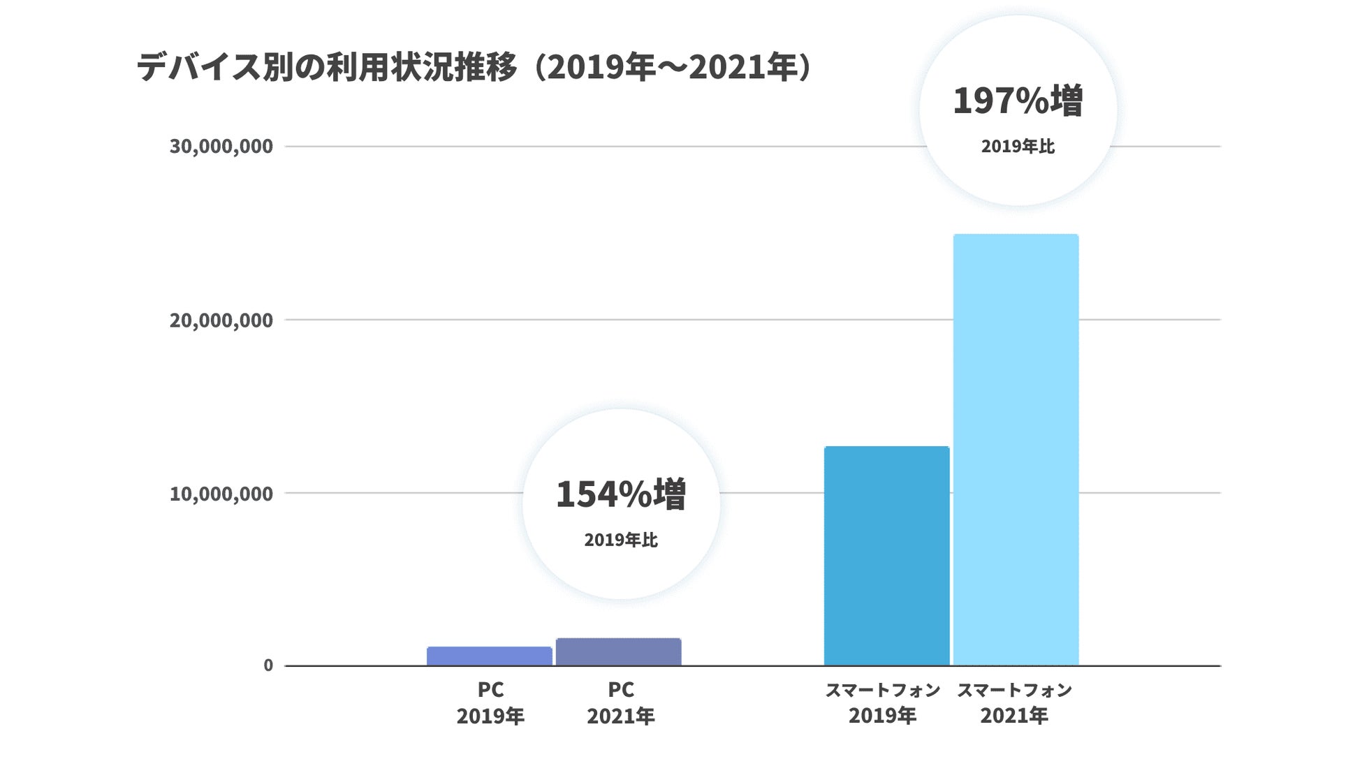 - デバイス別ではスマートフォンでの利用が9割以上で、2019年比での伸び率は197%