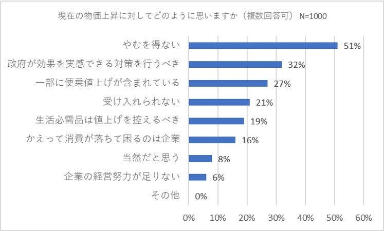 まず、現在の物価上昇についてどのように思っているかを質問(複数回答可)したところ、「やむを得ない」との回答が51パーセントでトップとなりました。2位には「政府が効果を実感できる対策を行うべき」(32パーセント)、3位には「一部に便乗値上げが含まれている」(27パーセント)が入りました。物価上昇をやむを得ないこととして受け入れつつも、便乗値上げに対する不信感がぬぐえない様子がうかがえます。