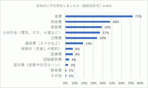 次は節約を行ったと回答した672人の方に「具体的に何を節約しましたか」(複数回答可)との質問を行ったところ、「食費」が72パーセントでトップ。以下、「娯楽費」(48パーセント)、「被服費」(39パーセント)、「公共料金」(37パーセント)、「交際費」(34パーセント)、「通信費」(19パーセント)が続きました。