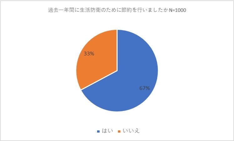 次に「過去一年間に生活防衛のために節約を行いましたか」と尋ねました。結果は「はい」が67パーセント、「いいえ」が33パーセントとなり、7割近くの方が節約を行ったことがわかりました。