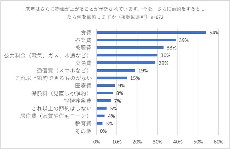 来年はさらに物価が上がることが予想されていますが、今後さらに節約を行う場合、何を節約するかを質問(複数回答可)したところ前項と同様、「食費」(54パーセント)、「娯楽費」(39パーセント)、「被服費」(33パーセント)、「公共料金」(30パーセント)、「交際費」(29パーセント)、「通信費」(19パーセント)が上位に並びました。また、「これ以上節約できるものがない」との回答も15パーセントありました。