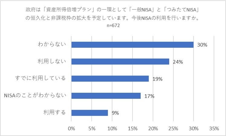 節約だけではいずれ限界が来る可能性があります。政府は個人の所得を増やす「資産所得倍増プラン」の一環として、配当や売却益などが非課税となる「一般NISA」と「つみたてNISA」の恒久化と非課税枠の拡大を予定していますが、「今後、NISAの利用を行いますか」と質問したところ、「わからない」が30パーセントで最多となり、以下「利用しない」(24パーセント)、「すでに利用している」(19パーセント)が続きました。「利用する」との回答は9パーセントにとどまるとともに、17パーセントの方が「NISAのことがわからない」と回答しました。