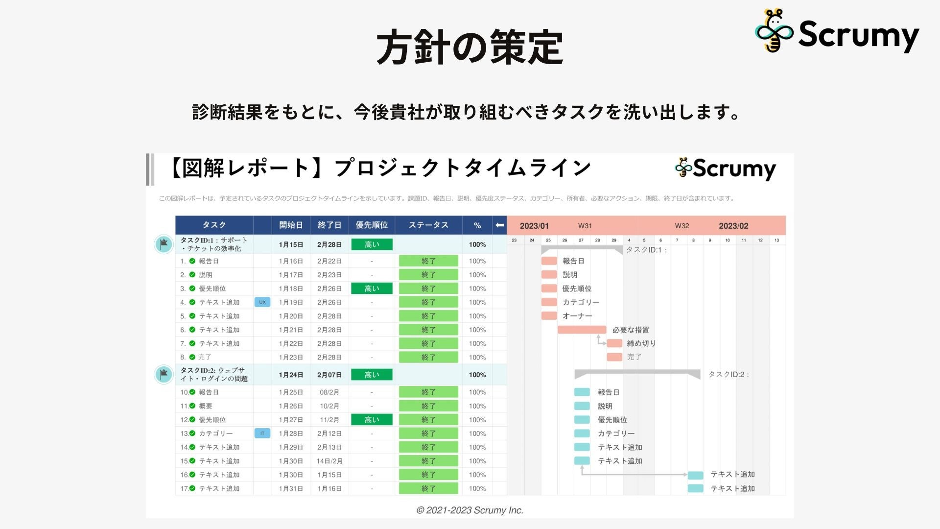 当社独自の社内サービスにより、表やグラフなどで可視化し、一目でわかるレポートを出力いたします。これにより、ご担当者様だけでなく、社内の共通理解として、レポートを回覧することにより、自社に合った適切なタスクを優先順位をつけて洗い出し、より早い意思決定をすることができます。