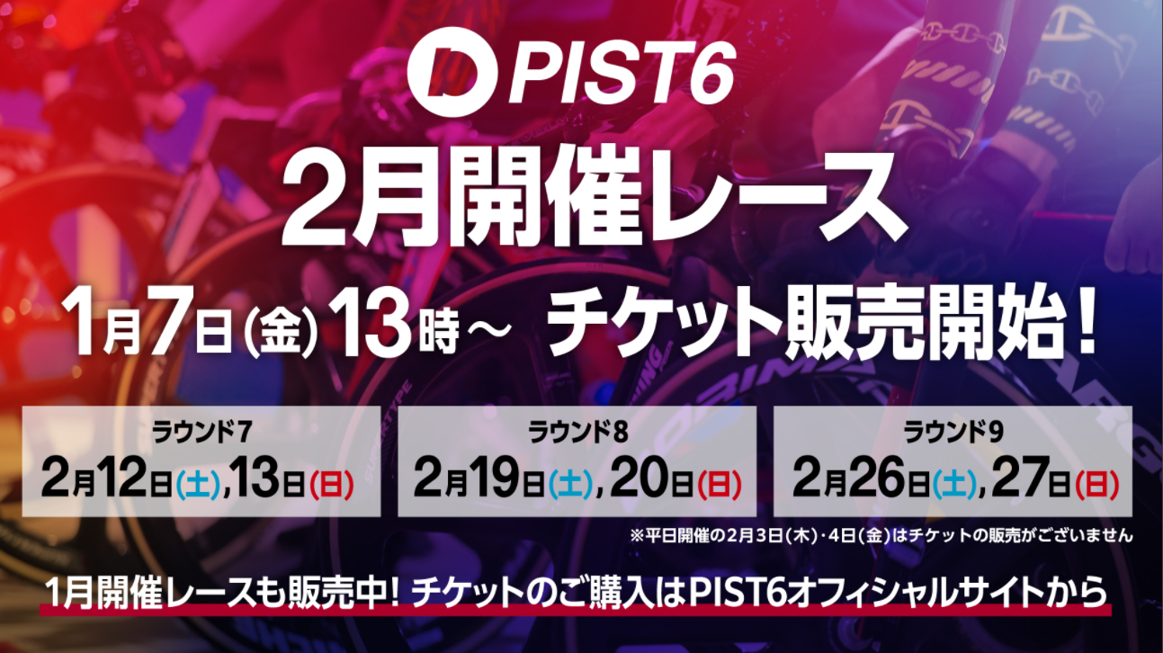 千葉市が主催する最高峰のスピード感を間近で体感できる新しい自転車トーナメント「PIST6 Championship(ピストシックス チャンピオンシップ)」は、千葉県の「新型コロナウイルス対策の特別措置法に基づく緊急事態宣言」が解除されたことを受け、収容制限50% ※1 のもと有観客で開催しています。また、1月より開催しているセカンドシーズン「PIST6 Championship ZERO」も収容制限のもと有観客での開催を決定していることから、2月開催レース ※2 のチケットを1月7日(金)13時00分より販売を開始いたします。