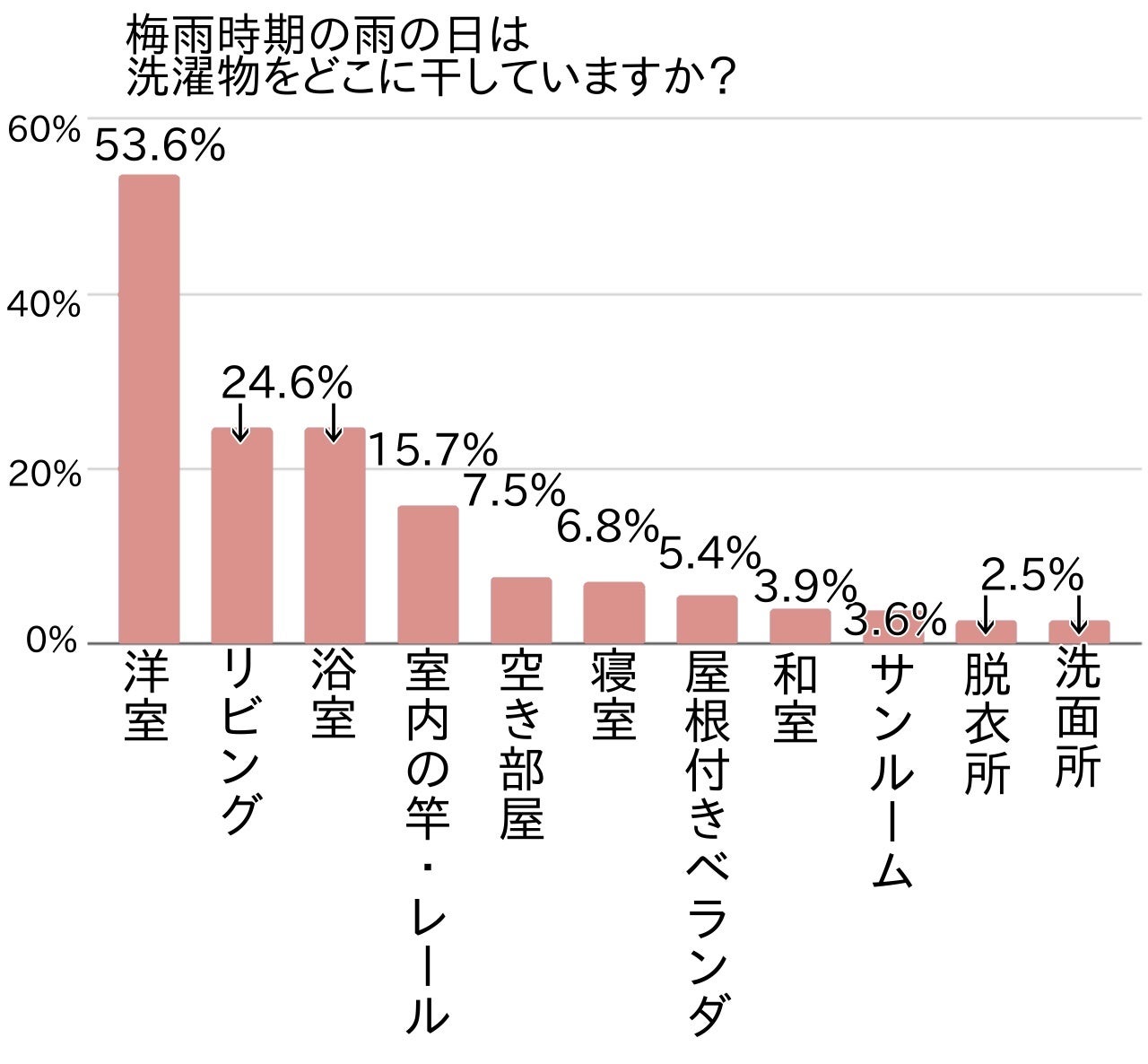 上記とは逆に、リビング(24.6%)、寝室(6.8%)に部屋干しする派である方もいらっしゃいました。部屋が広くて部屋干しのスペースを取りやすいこと、生活の中で頻繁に通る場所なのでこまめに乾き具合を見られることがメリットです。