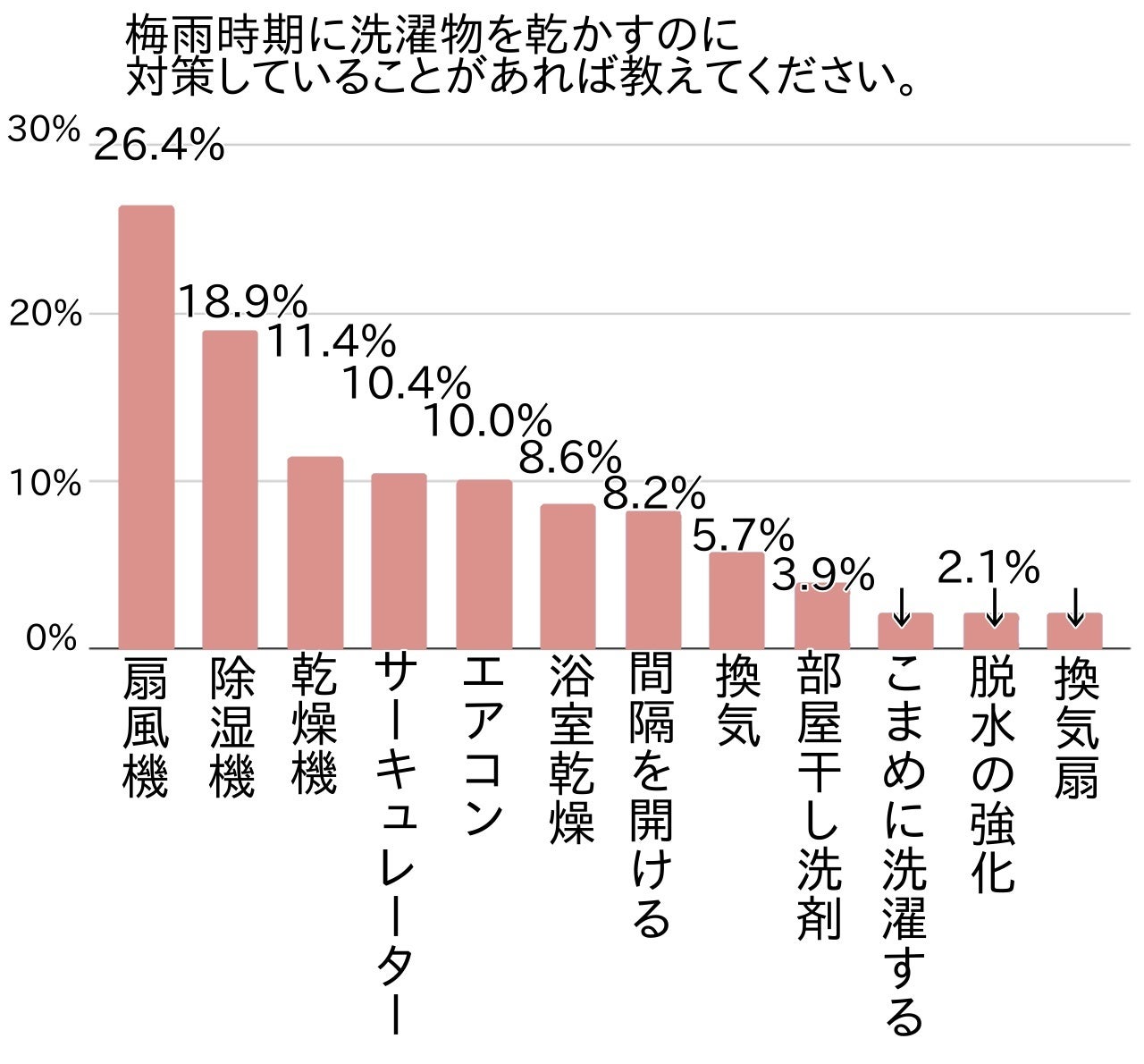 他にも風・温風・空気の流れで乾かす対策として、乾燥機(11.4%)、サーキュレーター(10.4%)、エアコン(10.0%)、浴室乾燥(8.6%)、換気(5.7%)、換気扇(2.1%)等がありました。