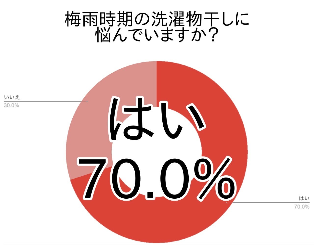今回の調査では、梅雨時期の洗濯物干しに悩んでいると答えた方は70.0%という結果になりました。