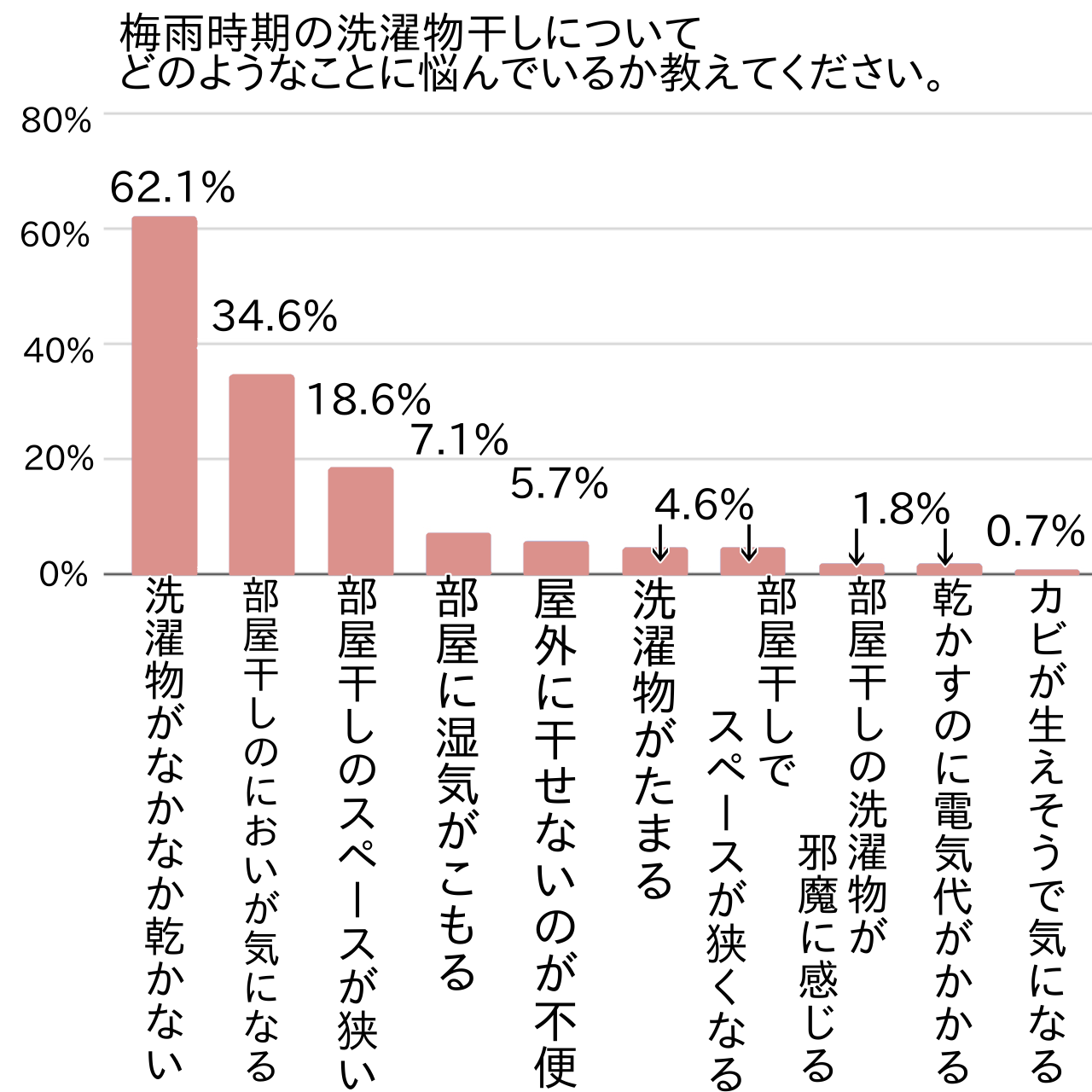 最も多く挙がった悩みは洗濯物がなかなか乾かない(62.1%)ことでした。雨の日の部屋干しがなかなか乾かないことに加え、湿度が高く曇りの日も多い梅雨時期だからこそ外干ししてもすっきり乾きにくい日が多いのも難点です。