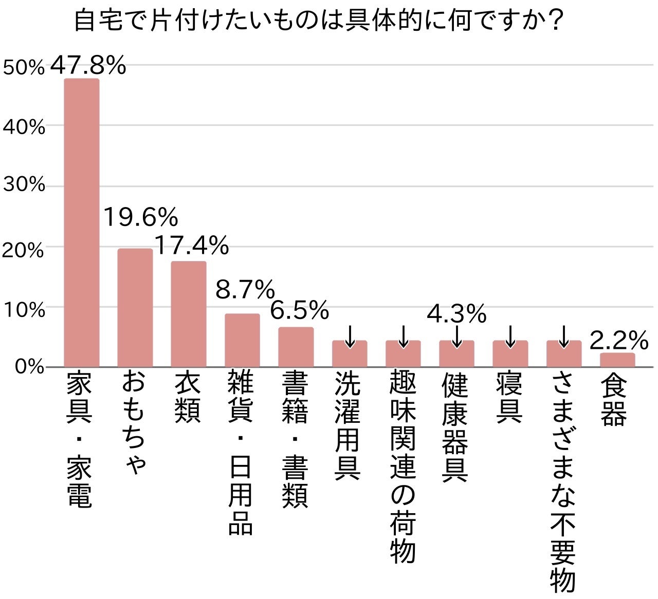 第1位は家具・家電(47.8%)でした。今回のアンケートでは、今は頻繁に使わない家具があり、自宅内でスペースを取っているケースや、シーズンオフの家電が邪魔になっているケースが頻繁に見られました。
