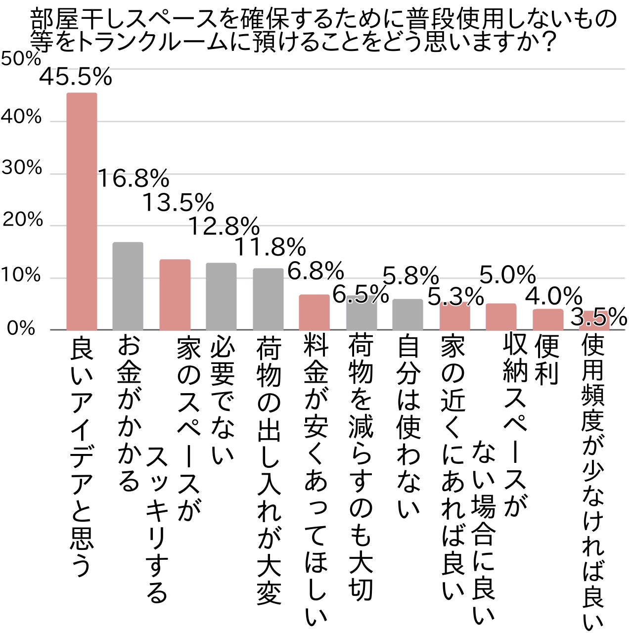 中でも、普段頻繁に使わないものをトランクルームに置けたら家のスペースがスッキリする(13.5%)、便利(4.0%)、(利用に前向きなために)料金が安くあってほしい(6.8%)、家の近くにあれば良い(5.3%)という意見が目立ちました。