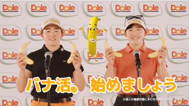 バナナに含まれる「レジスタントスターチ」に腸内環境を整える効果が期待されることから、ラウンド中でもドールのバナナを食べてエネルギーチャージをするという岩井姉妹。そんな岩井姉妹へドールからの応援の想いを込め、岩井姉妹を起用した広告を2023年6月19日~7月2日の期間に、テレビ朝日の某人気番組内で6回、枠外で22回、さらにYoutubeにて配信いたします。