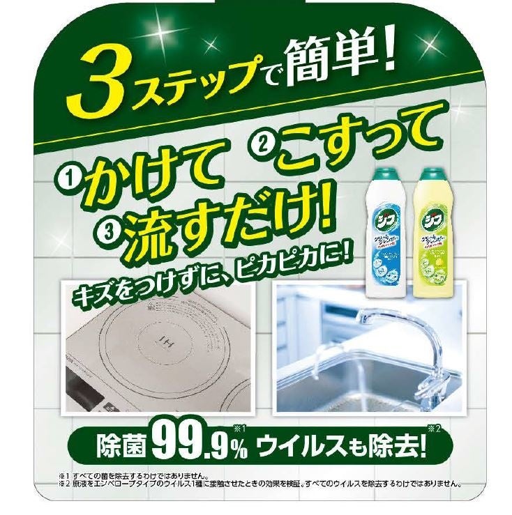キッチンの油汚れや頑固な水アカも、ジフをつけて柔らかいスポンジでこするだけでスッキリきれいに汚れを落とすことができます。石英などの研磨材を使用しているクリームクレンザーの場合はステンレスなどにキズをつけてしまう恐れがありますが、ジフに使われている研磨材はガラスやステンレスより柔らかい100%天然成分「カルサイト」を使用していることから、キッチンやお風呂を傷つけにくいのが特長です。そして、ジフもしっかり除菌99.9%*2、 ウイルスも除去*3!