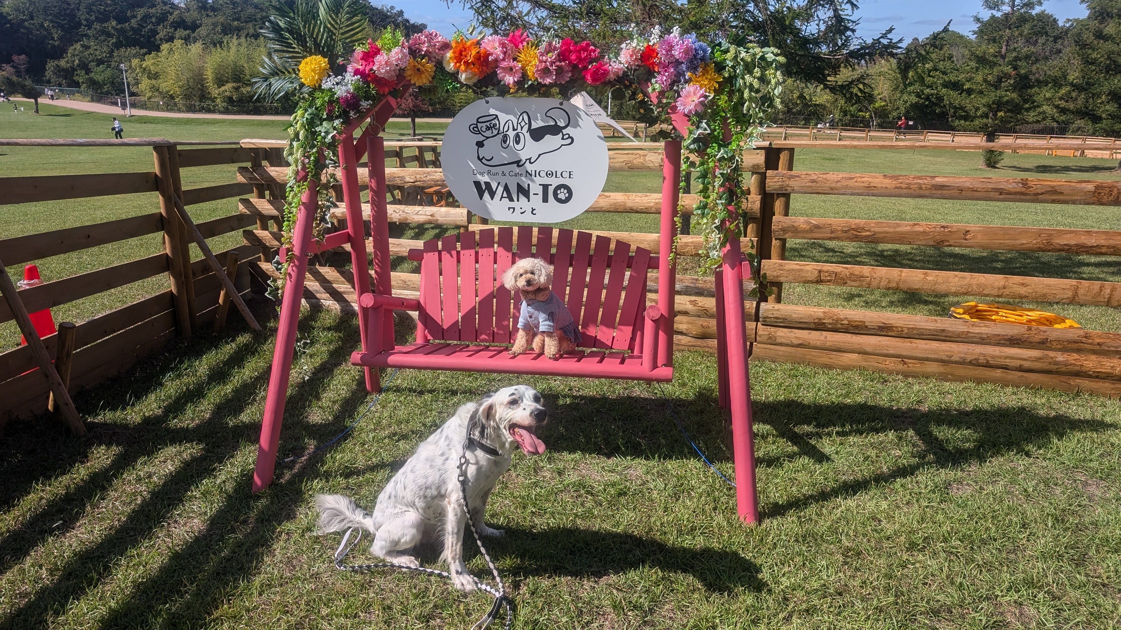 お花がかわいいピンクのベンチブランコで記念撮影を楽しめます。カフェスペースにあるワンちゃん専用フォトスポットで素敵な思い出を残してください。
