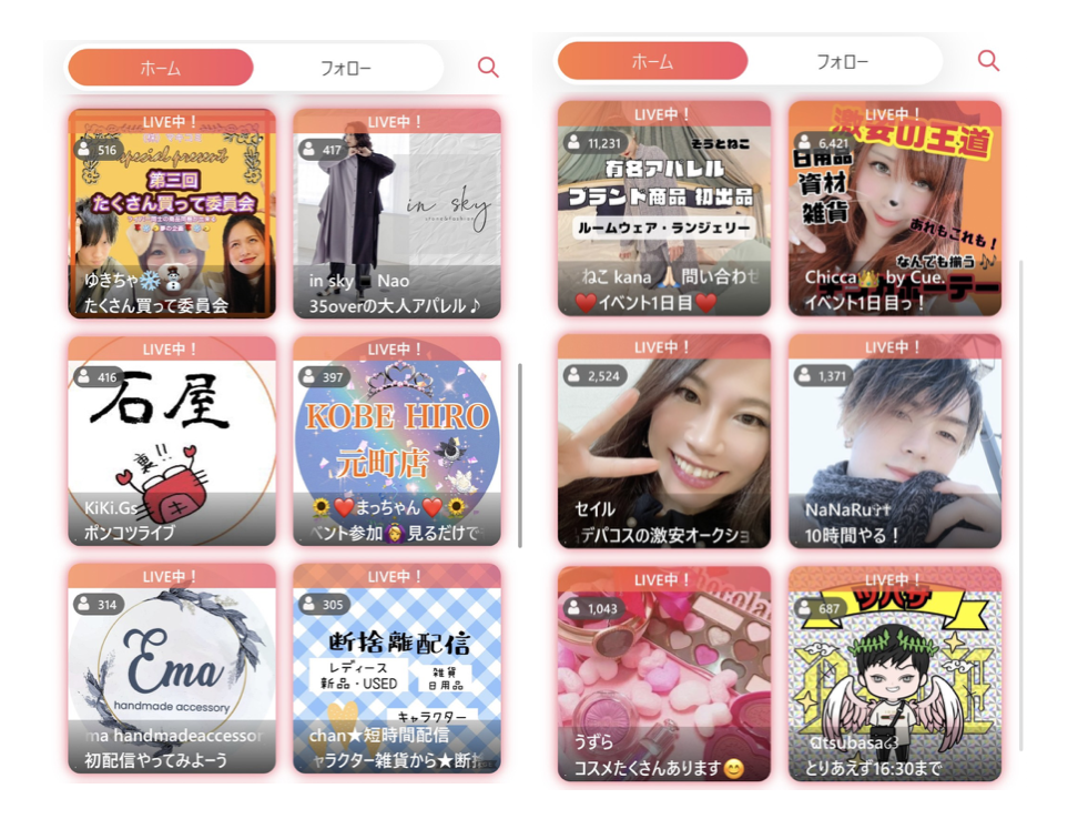 ホーム画面上で表示される順番は 視聴数によって決まり、人気の配信では1時間で2,000人以上の視聴数になる事も多く、配信者は様々な企画やイベントを各自実施する事で より多くの視聴者に見てもらえるように努力しています。