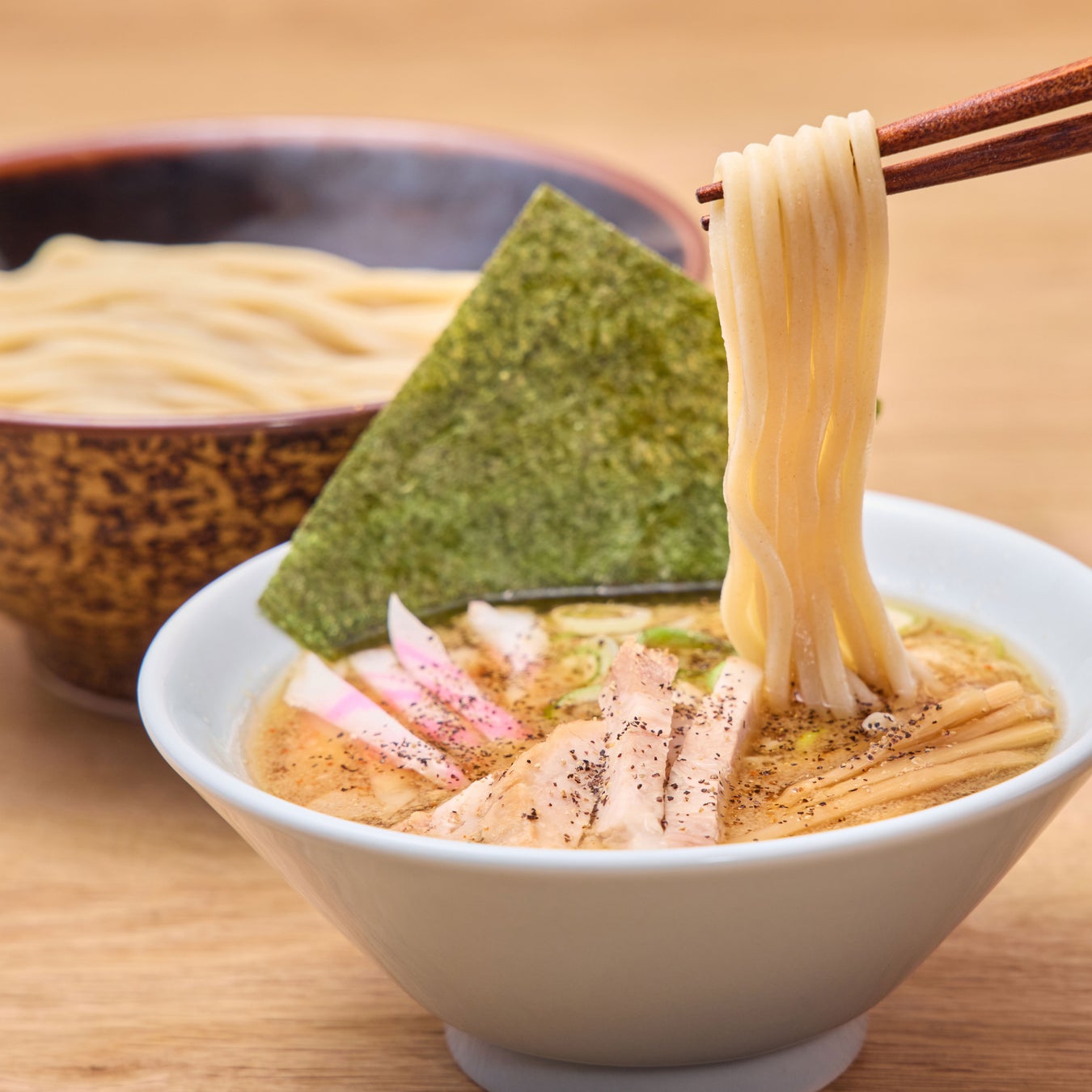 具材はチャーシュー、メンマ、ナルト、海苔とシンプルだが、それぞれの素材から出る旨味もつけダレに加わり、麺・具材・つけダレの三位一体となり完成される商品。