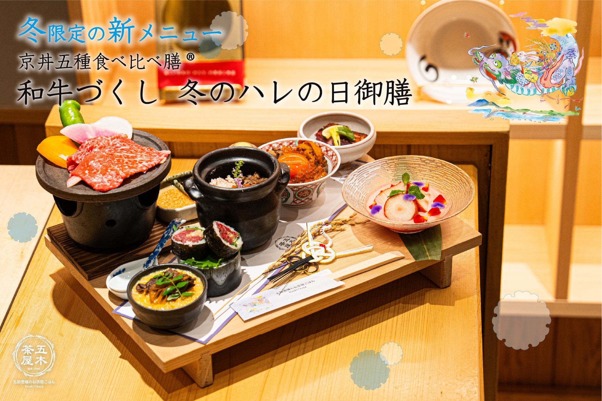 五穀豊穣のお茶屋ごはん®︎ 五木茶屋 先斗町店では、厳選された冬の食材を使用した【冬の京丼五種食べ比べ膳®︎】をご用意致しました。厳選された和牛と冬の素材を使用した贅沢な膳をお楽しみいただけます。寒い季節にほっこりと温まる料理で、京都の冬を満喫ください。