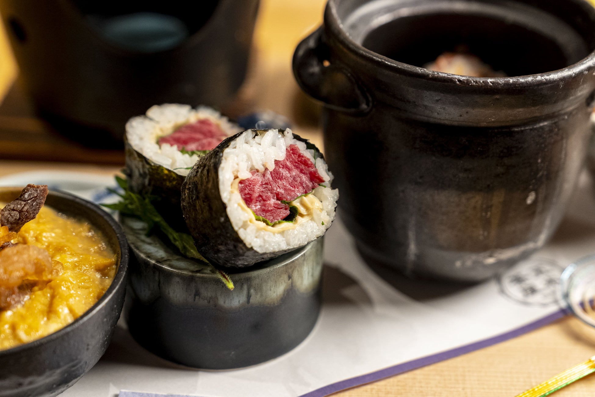 贅沢な和牛ウチモモをレアに仕上げ、京都名物の生湯葉、大葉、茗荷などの薬味と共に巻き寿司に。