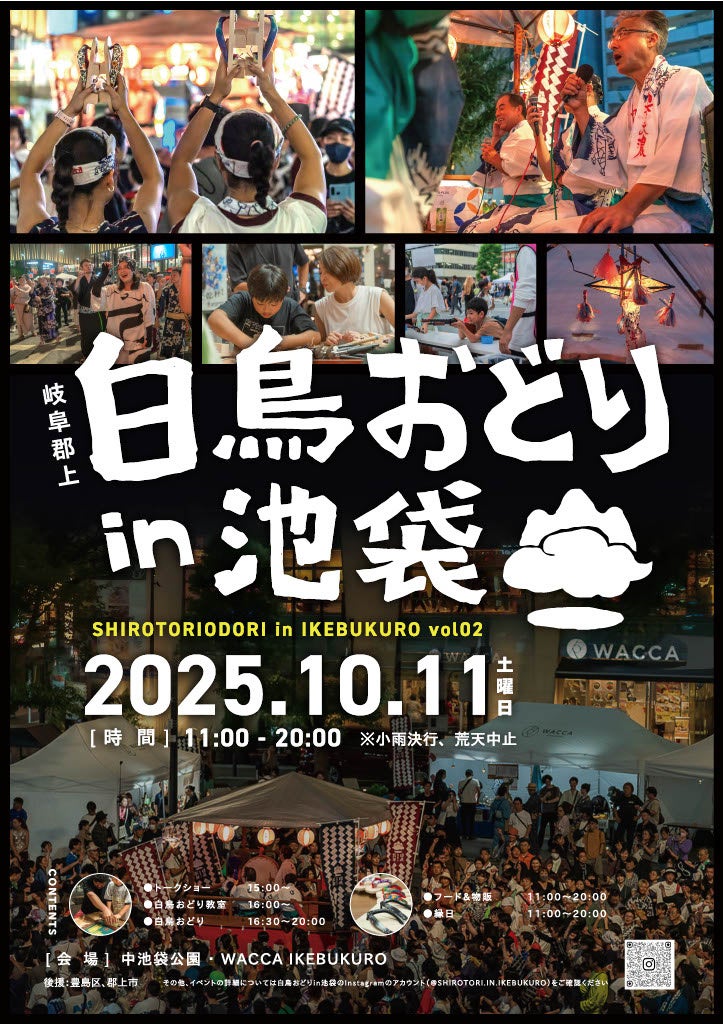 岐阜県郡上市・白鳥地区に伝わる「白鳥おどり」を東京・池袋で体感できるイベントを開催します。今年は“鮎の塩焼き”も登場!郡上のカルチャー体験、オリジナル踊り下駄ワークショップなど、楽しみどころ満載です!