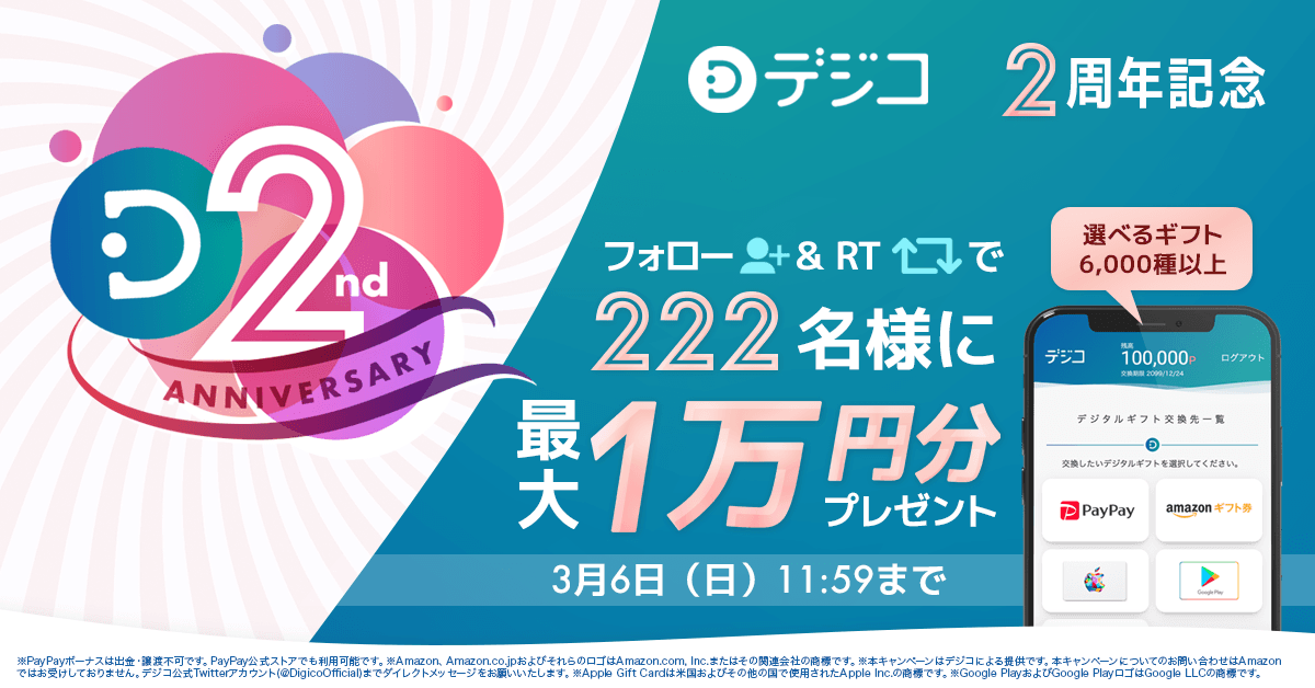 デジタルギフト「デジコ」2周年記念!最大1万円相当が222名様に当たるキャンペーン