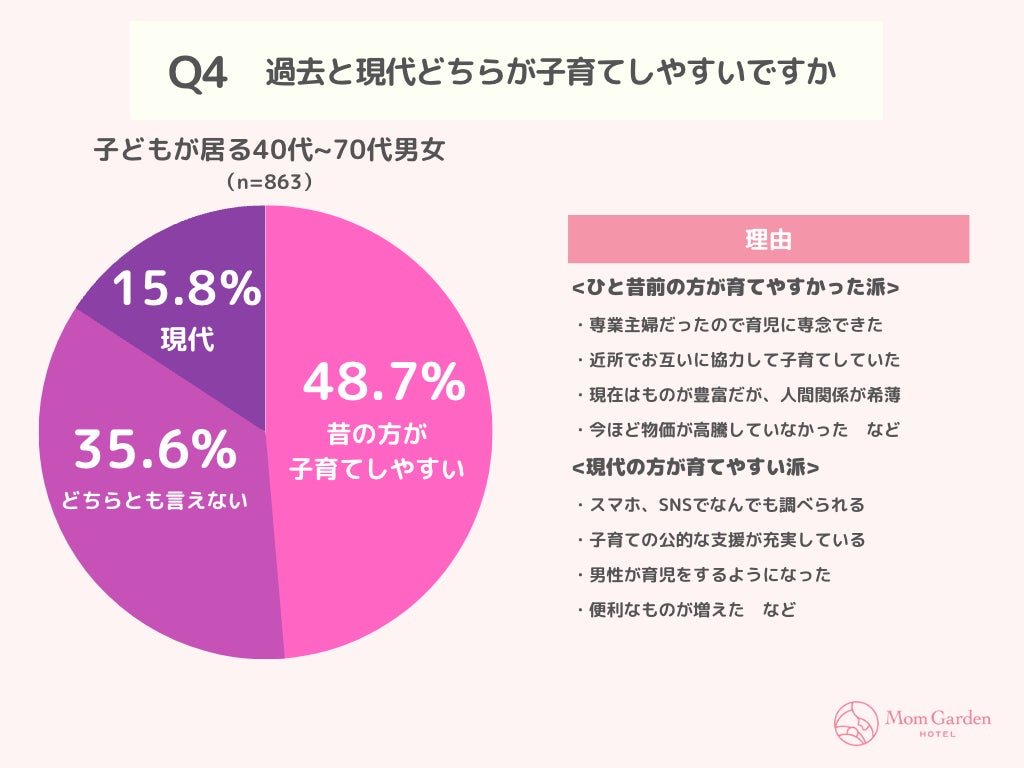 「現代よりも祖父母世代の子育て時代の方が育てやすい」と回答した人は、「現在の方が育てやすい」と回答した人よりも3倍も多い結果となりました。