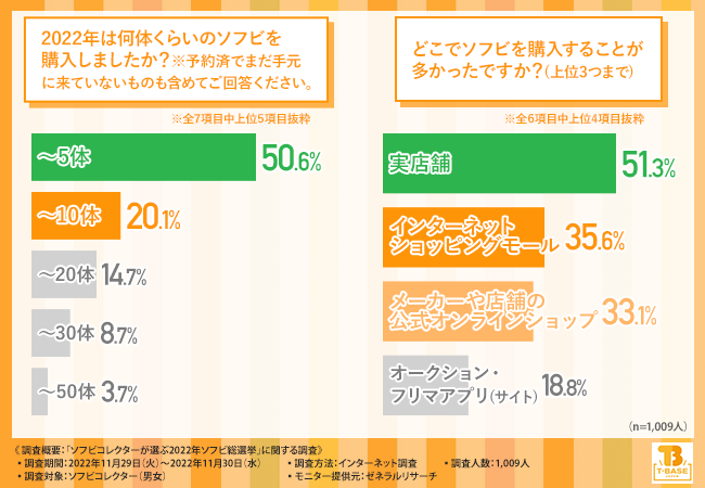 - 2022年のソフビ購入数は「5体」、購入先は「実店舗」が半数以上