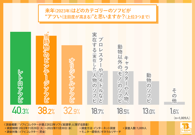 「来年(2023年)はどのカテゴリーのソフビが“アツい(注目度が高まる)”と思いますか?(複数回答可)」と質問したところ、『レトロソフビ(“レトロデフォルメ”と呼ばれるスタイルで作られたソフビ)(40.3%)』と回答した方が最も多く、次いで『“当時物”のビンテージソフビ(マルサン商会製、ポピー製など)(38.2%)』『オリジナルソフビ(作家さんによるインディーズソフビやショップ限定品など)(32.9%)』と続きました。