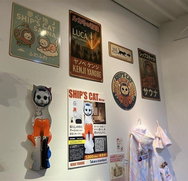 また、《SHIP’S CAT SAUNA》の発表を記念して、ヤノベケンジ氏がデザインした、オリジナルのミニチュア看板とホーローコースターを2種類制作しました。ホーロー看板に関するアンケートにお答えいただいた方の中から、抽選で40名さまにプレゼントします。