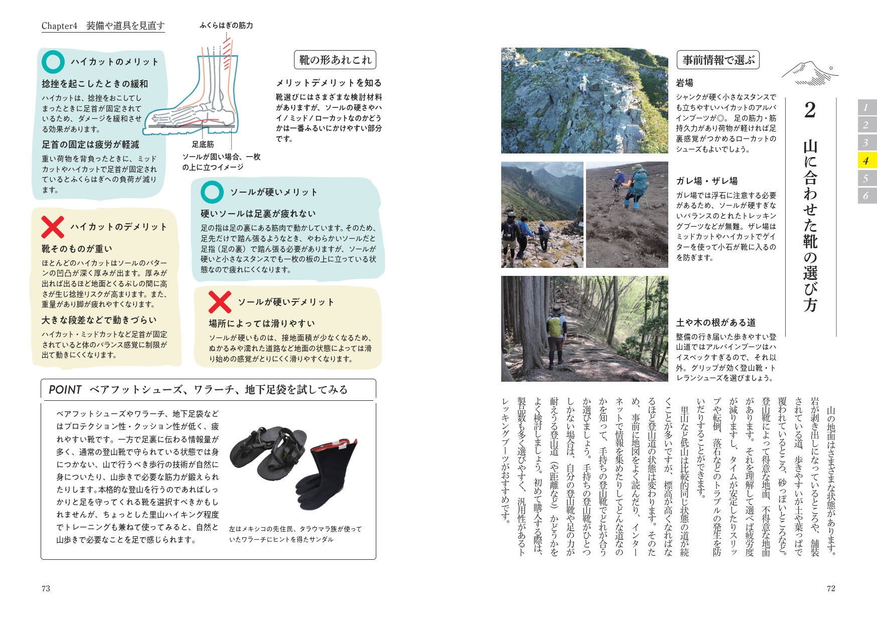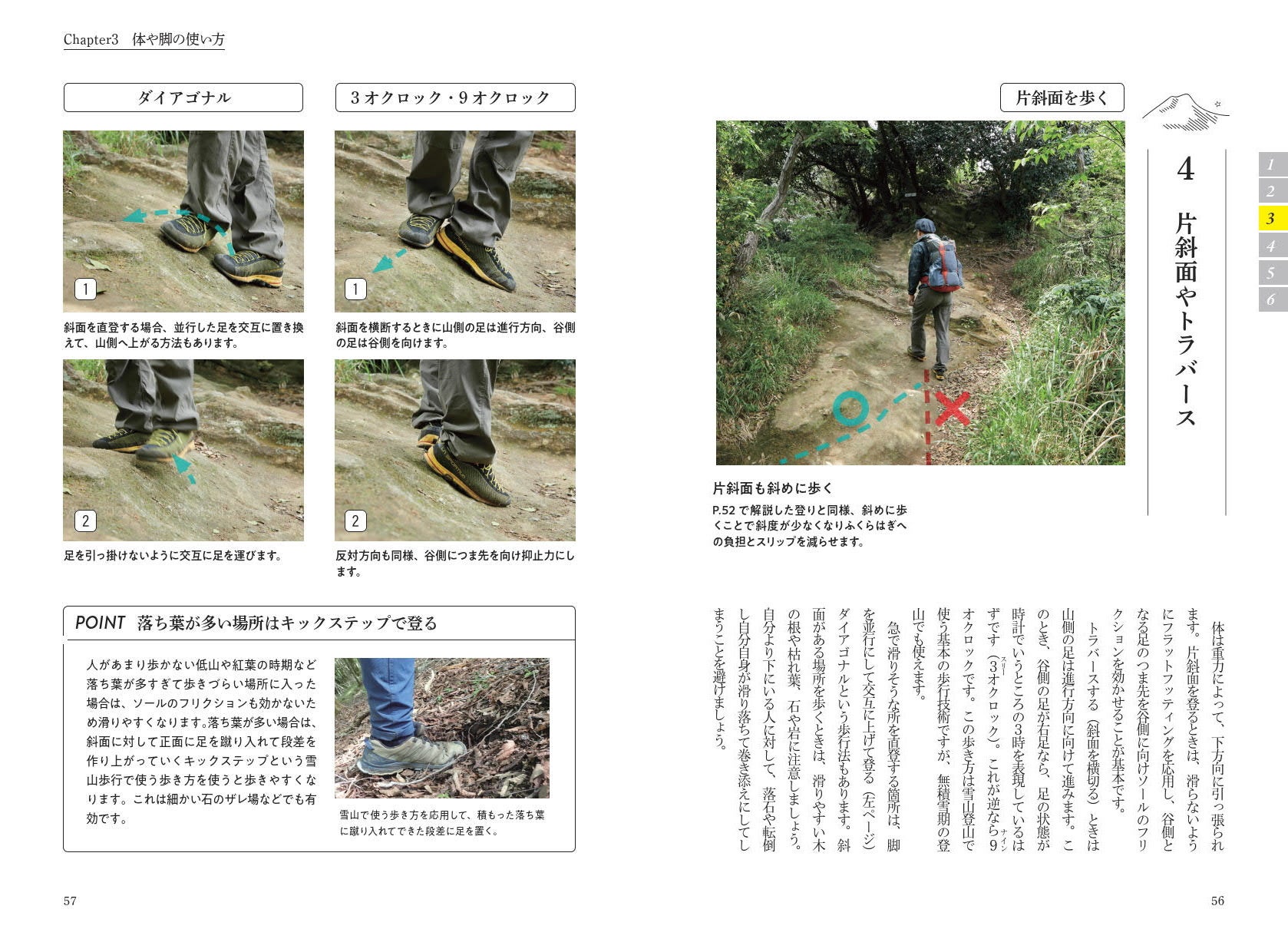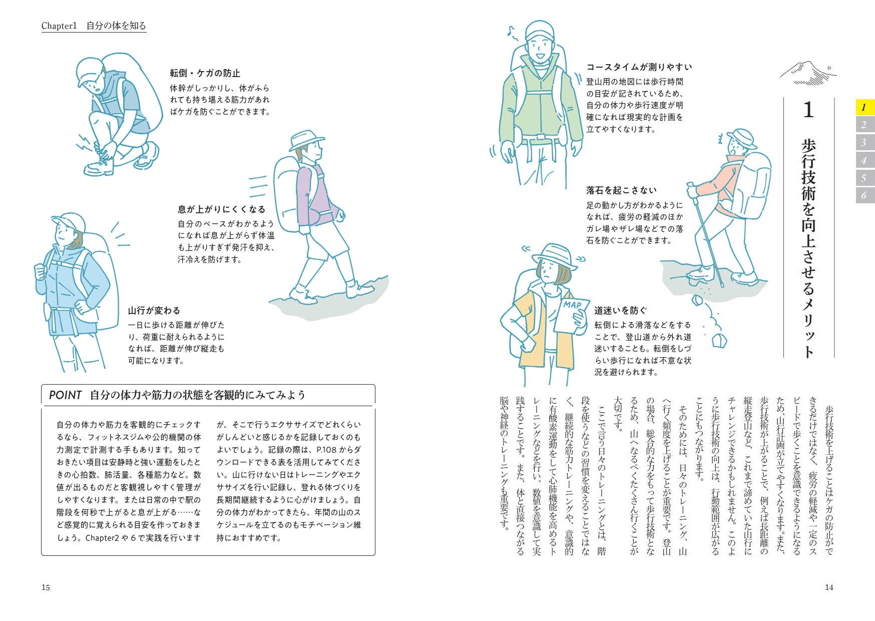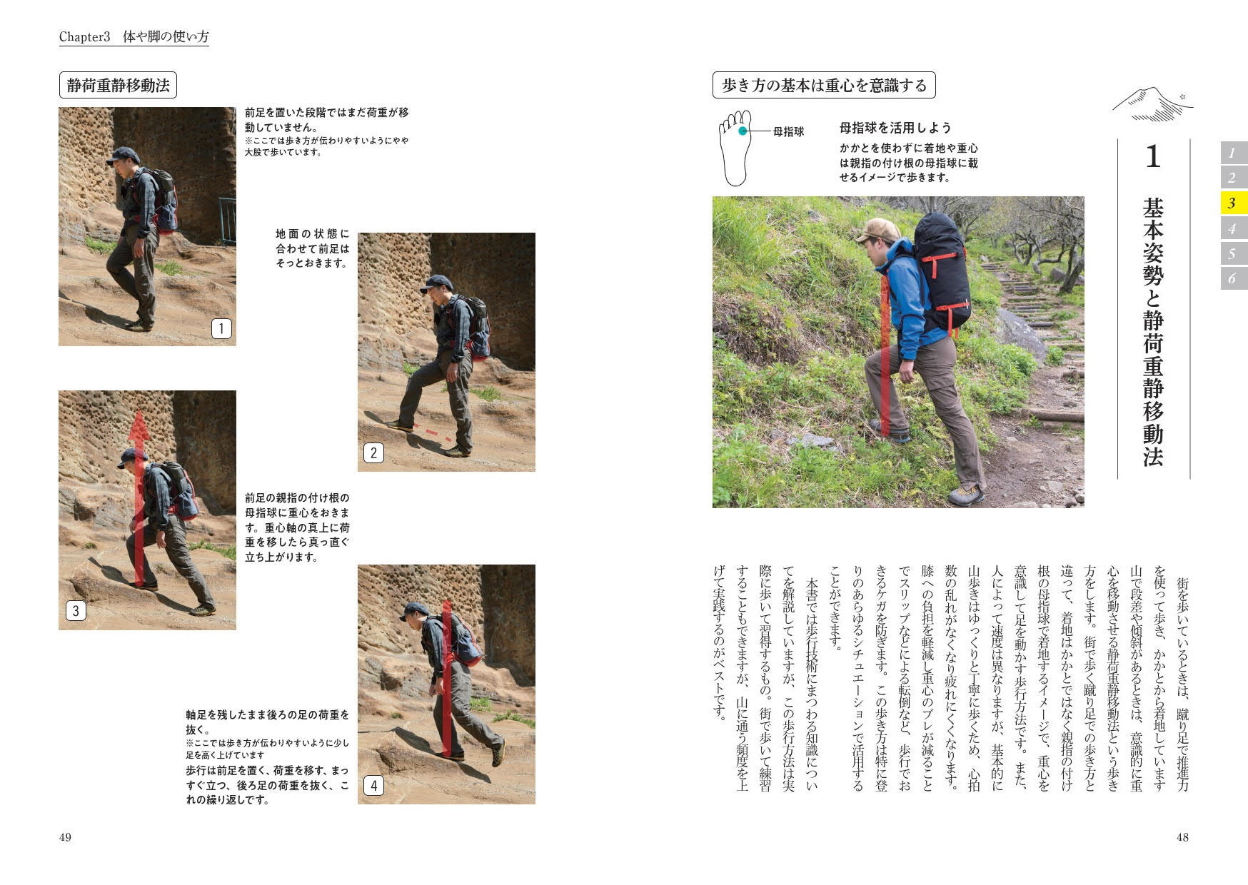 本書は、自分の体がどのように動くのかを理解し、山を歩くために必要な運動能力を知るところから始まります。自分の体を知ることでトレーニングのイメージがより具体的になるためです。その上で、山での脚の運び方、歩き方などの基本姿勢から、方斜面やトラバース(斜面を横切る)での歩き方、くさり場などの歩き方を解説しています。また、道具や装備の扱い方や選び方、山行計画の考え方、トレーニングの方法も紹介しています。