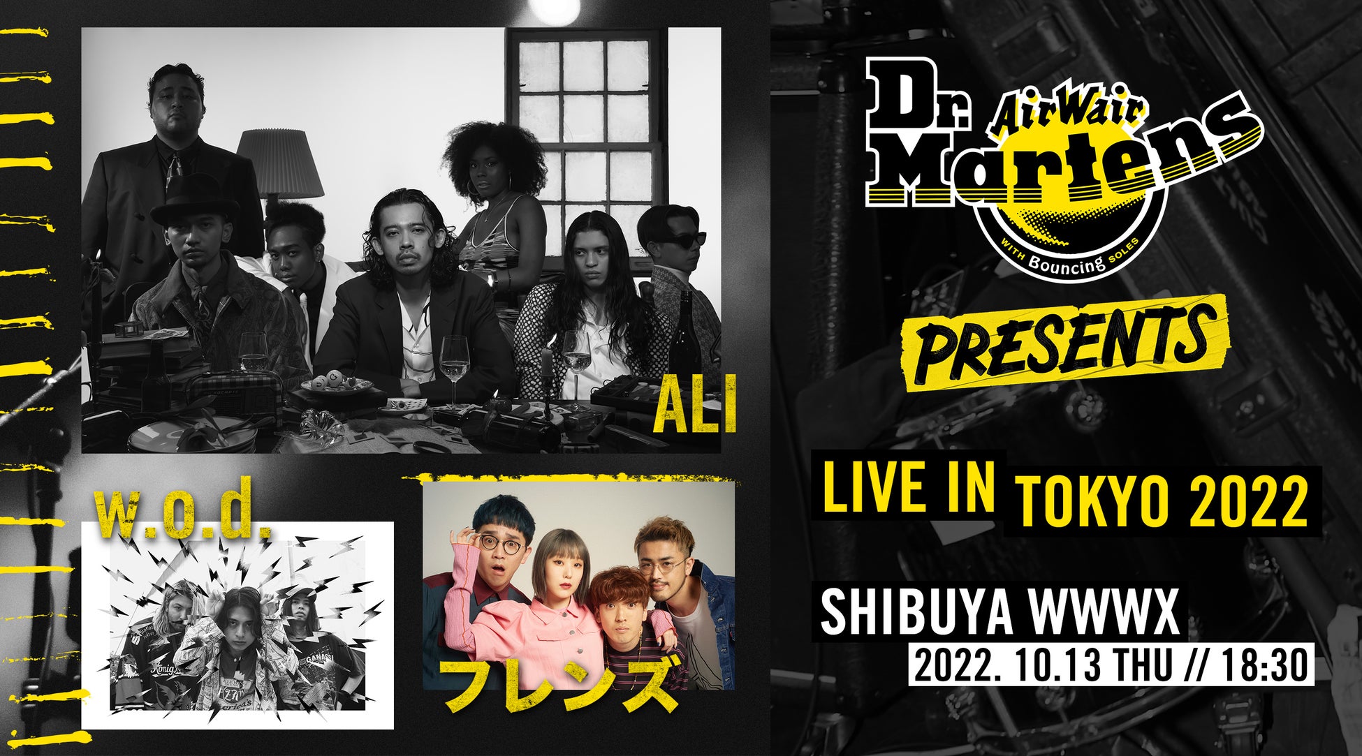 | 公演タイトル:「DR. MARTENS PRESENTS - LIVE IN TOKYO 2022」 日程:2022年10月13日 (木) 開場:17:45 / 開演:18:30 会場:渋谷WWWX 出演者: ALI, フレンズ, w.o.d. チケット先行販売:e+ https://eplus.jp/dr.martens-2022/(8/8 12:00〜8/14 23:59) 一般販売:e+、ぴあ、楽天、ローソンチケット(8/20 12:00〜) 企画・制作:シブヤテレビジョン 協力:WWWX *本公演は政府及び自治体等のガイドラインに従い、新型コロナウイルス感染予防と拡大防止のための最大限の対策を講じた上で開催することを予定しております。 |