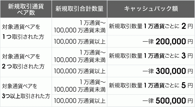 ・3つの対象通貨ペアで合計500万通貨を新規取引⇒ 2,500円キャッシュバック