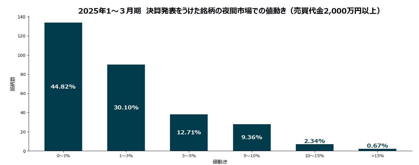 次は決算に関連した動きです。上記の棒グラフは、当該期間に決算発表をした銘柄のうち、「夜間市場」での売買代金が2000万円以上のみを抽出し、「夜間市場」での決算発表銘柄の価格の変動幅がどの程度だったかについてまとめたものです。これをみると、3%以上の値動きがあった銘柄はそのうち25%程度、1~3%の値動きのものまで含めると約55%が該当します。