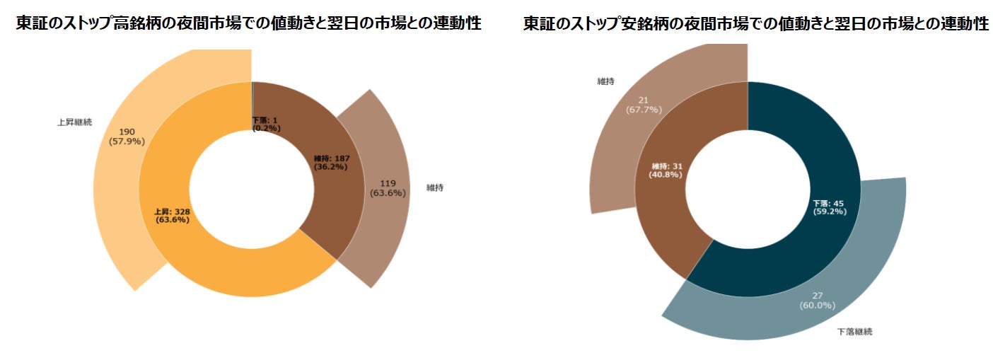 上記のグラフは、それぞれ左側がストップ高、右側がストップ安となった銘柄について、その後の動きはどうなったかという考察となっております。左側のグラフでは、当四半期中にストップ高となった銘柄は516ありました。そのうちの約64%(328銘柄)は「夜間市場」においても上昇、更に、それらの銘柄のうち58%(190銘柄)は、翌日の東証においても上昇が継続しました。