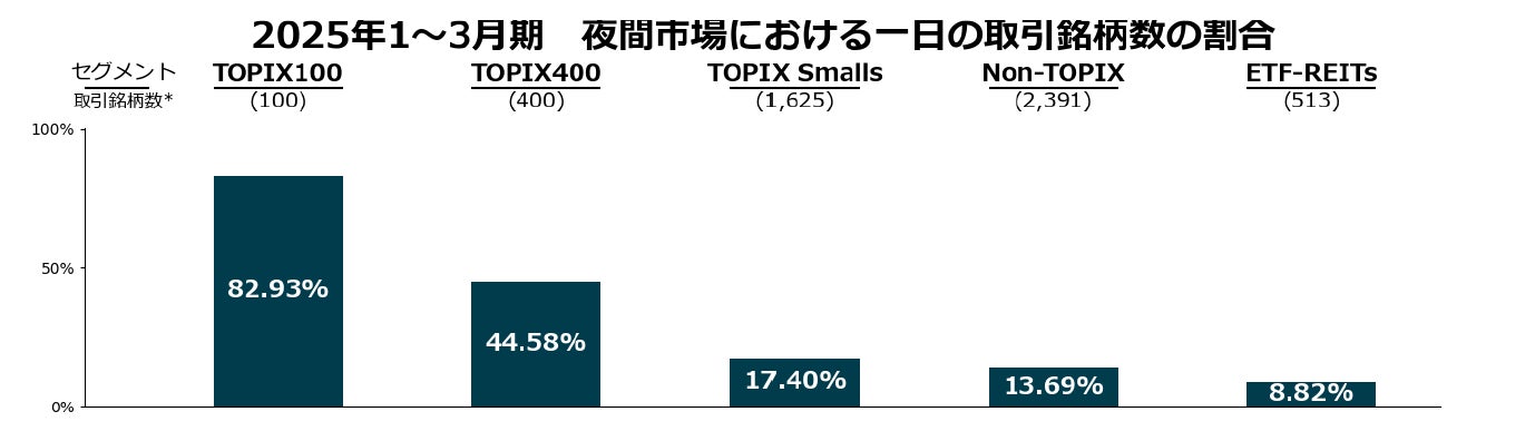 一方、直近四半期の「夜間市場」の一日あたりの平均取引銘柄数については、前四半期に比べ若干増加しているものの総じて横ばいの状況でした。セグメント別で見ても、TOPIX 100とTOPIX MID 400は総じて比較して横ばい、TOPIX Small、Non-Topixについては若干の増加となりました。
