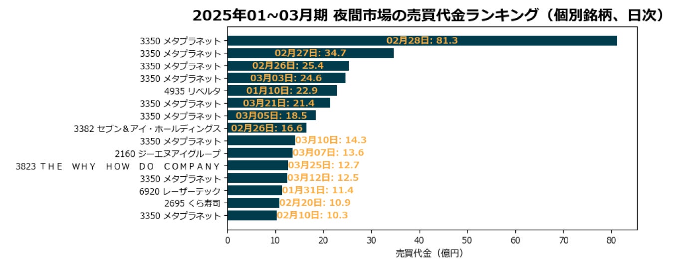 一方、個別銘柄では、「メタプラネット(3350)」の売買が他の銘柄に比べて突出する結果となりました。これは当該期間の日次ベースの銘柄毎の売買代金ランキングで見ても、その多くが同銘柄であることから、当該期間における同銘柄の人気が非常に高かったことが窺えます。