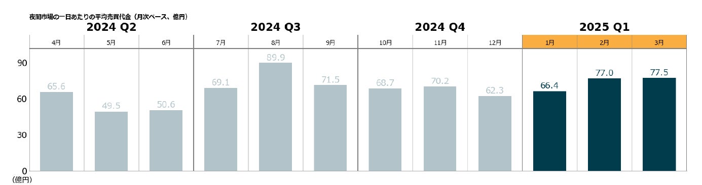 2025年第1四半期の「夜間市場」の一日あたり平均売買代金は、前四半期末から増加傾向を示し、3月には77.5億円となりました。売買代金が100億円を超える日も散見されるなど、好調なスタート状況となっております。