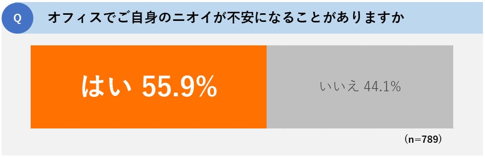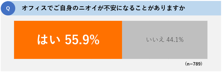 全体の55.9%の人が「オフィスで自身のニオイが不安になることがある」と回答しました。今後、対面でのコミュニケーションが増え、マスクの着用が減っていくなかで、ニオイを不安に感じる人が増える可能性も十分に考えられます。