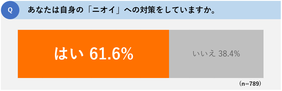 また、実際に何かしらのニオイ対策をしている人は全体の61.6%にのぼり、マナーとしてのニオイ対策が浸透している様子が見られました。